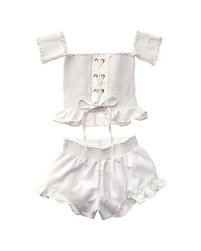 - Design details: smocked off-the-shoulder top with lace-up back, smocked waist short and ruffle trim
