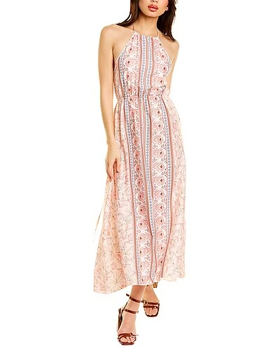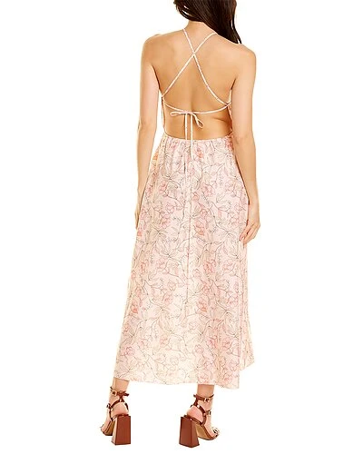 - Design details: halter neck, open back, elasticized waist, center front slit at hem