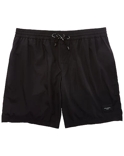 - Swim Trunk in black with elasticized drawstring waist, dual side seam pockets and zippered back pocket