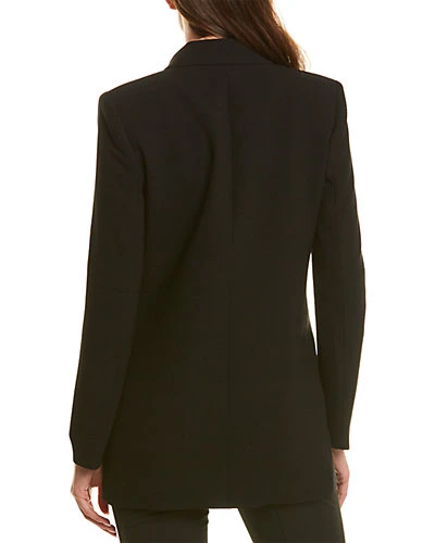 - Design details: peak lapel, left chest pocket, dual front pockets, and button cuffs