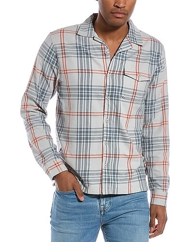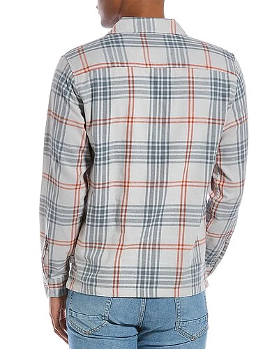 - Flannel Convertible Overshirt in stormy blue with spread collar, left chest pocket, and button cuffs