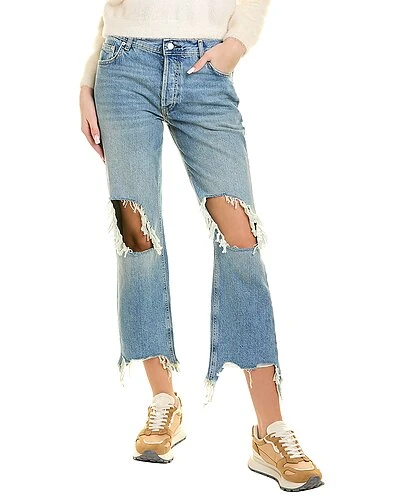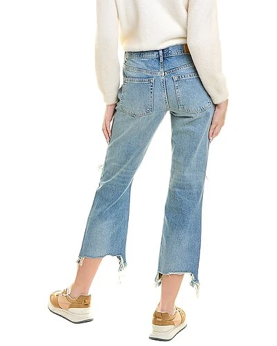 - Maggie Mid Rise Straight Jean in navy with belt loops, classic five-pocket styling, destroyed knees, and frayed hem
