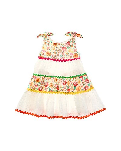 - Design details: tiered construction, swiss dot detailing, bows at shoulders and ricrac trim