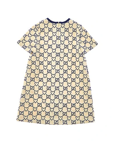 - Dress in white/blue with embroidered design, bow detail, button accents and inverted front pleat