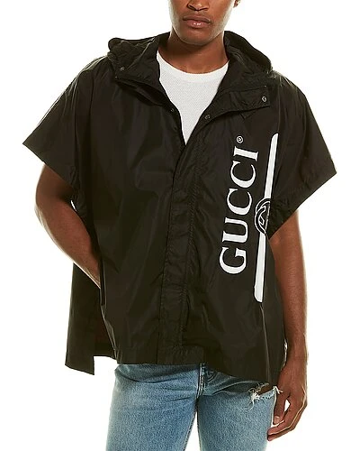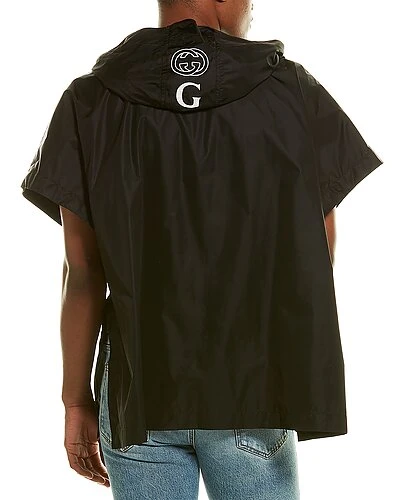 - Nylon Cape in black/white with removable hood, snap-close cape sleeve, and logo detail