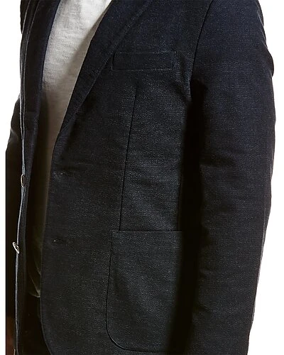 - Lisbon Blazer in heather navy with notch lapel, left chest pocket, dual front pockets, button cuffs, and side vents