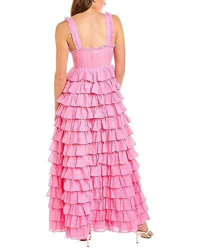 - Idra Maxi Dress in hot pink cherry with straight neckline, ruffle trim, and layered frill skirt