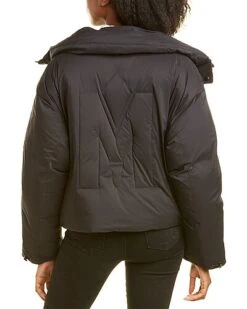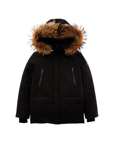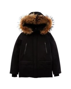 - Jo Parka in black with stand-up collar, removable hood, fur trim, dual chest pockets, dual front pockets, and ribbed inner cuffs