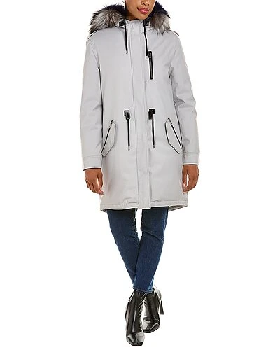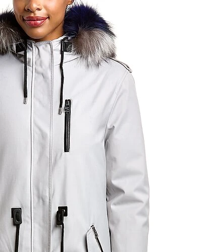 - Rena DX Leather-Trim Down Parka in mineral with hooded back, removable fur trim, chevron quilted lining, zippered left chest pocket, four front pockets, inner knit cuffs, zippered interior pockets, drawcord at waist, and leather trim
