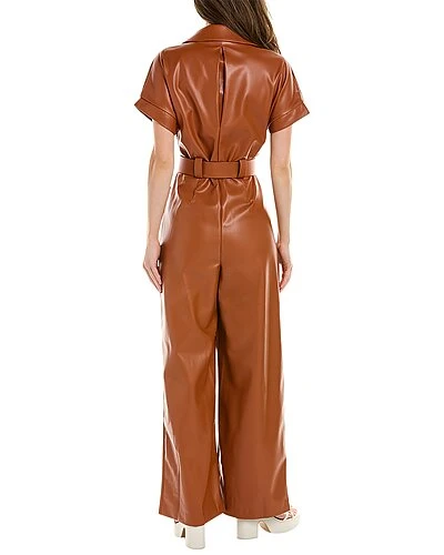 - Design details: faux leather construction, spread collar, belted waist and dual front pockets