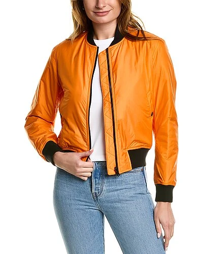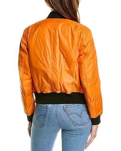 - Manston Bomber Jacket in orange with shawl collar, dual snap-button pockets, and sleeve pocket detail