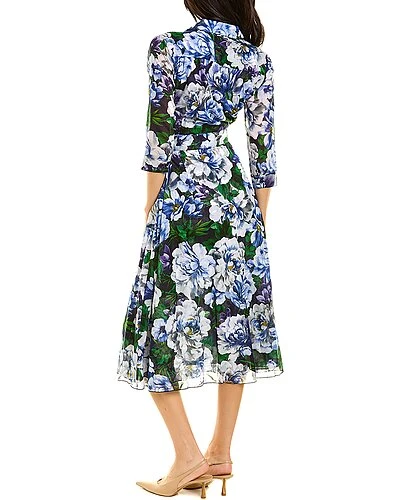 - Abel Shirtdress in camellia flower midnight blue with 3/4-length sleeves, side slip pockets, belted waist, and removable tie-sash