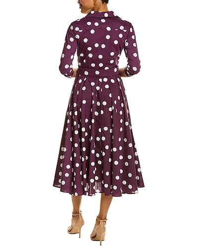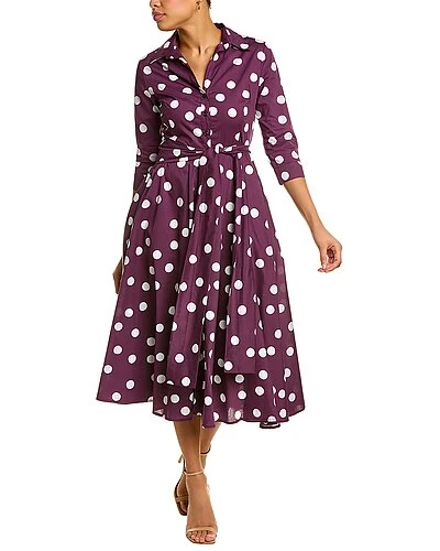 - Aster Shirtdress in plum dot with 3/4-length sleeves, pleated skirt, side seam pockets, belted waist, and matching tie sash