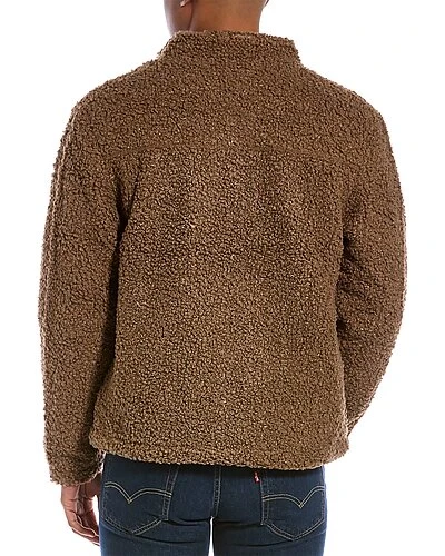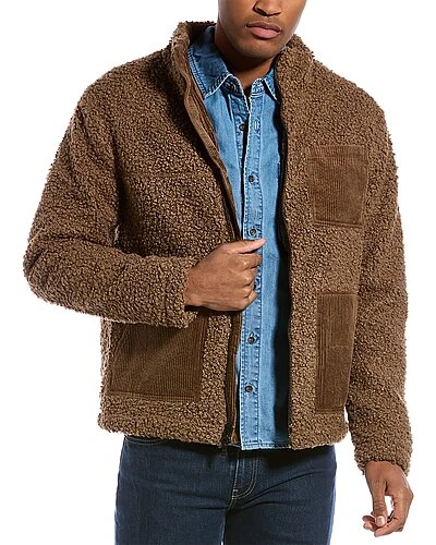 - Sherpa Jumbo Corduroy Shacket in bison with fuzzy design, corduroy paneling, left chest pocket, dual front pockets, and stand-up collar