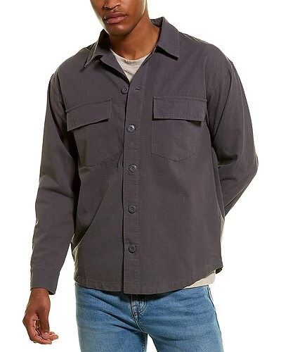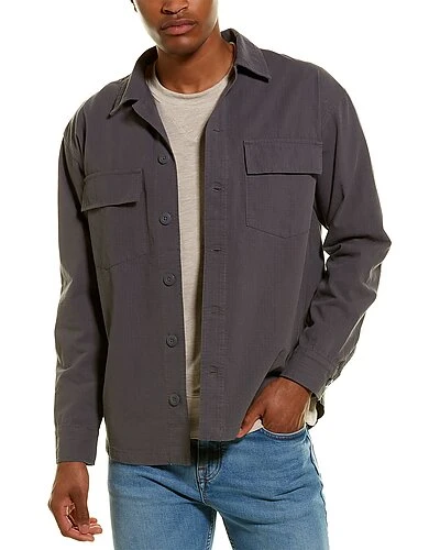 - Shirt Jacket in Neptune with dual chest pockets, barrel cuffs, pleats at back, and shirttail hem