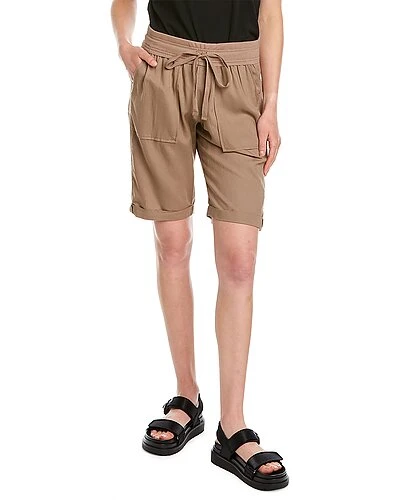 - Jasper Linen-Blend Short in mocha with elasticized waistband, four-pocket styling, ribbed side panels, and cuffed hem