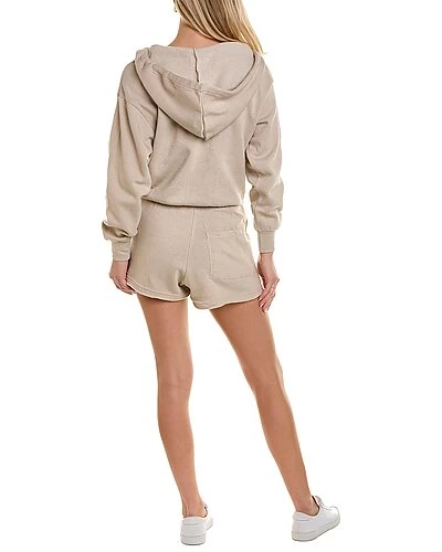 - Surplice Romper in nude mink with hooded back, fleece lining, dropped-shoulder sleeves, elasticized waist, two front pockets, and right back pocket