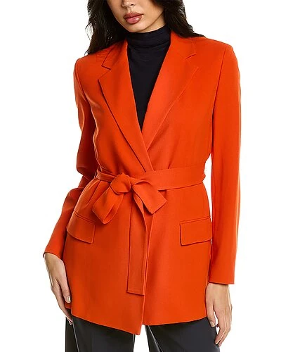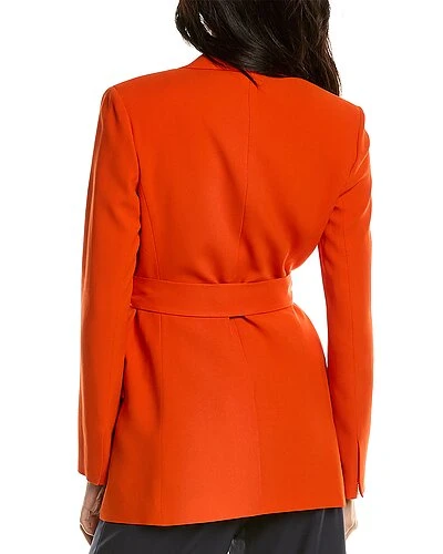- Belted Blazer in fire opal with notch lapel, dual front pockets, and self-tie sash at waist