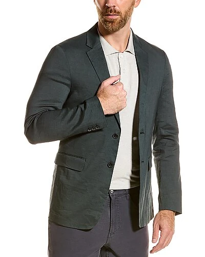 - Clinton Eco Crunch Linen-Blend Blazer in virdis with notched lapel, two front flap pockets, button accents at cuffs, center vent at back hem and two interior pockets