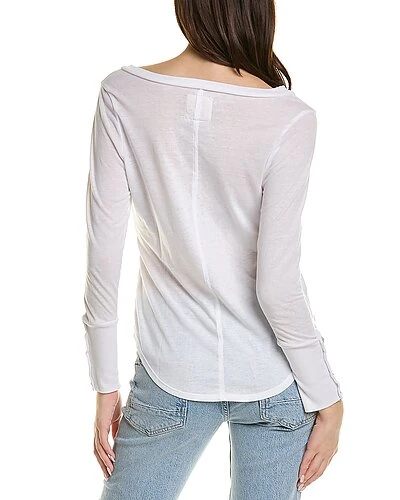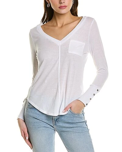 - Design details: V-neck, exposed seaming, and shirttail hem