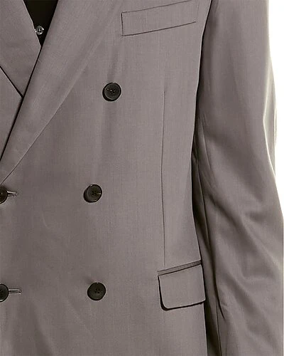 - Double-Breasted Wool Blazer in grey with peak lapel, left chest pocket, two front pockets, button cuffs, and side vents at back hem