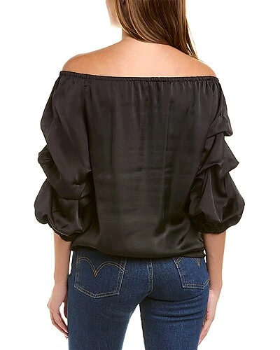- Off-The-Shoulder Top in rich black with elasticized neckline, hem, and cuffs, ruched elbow-length sleeves, and tie side at left